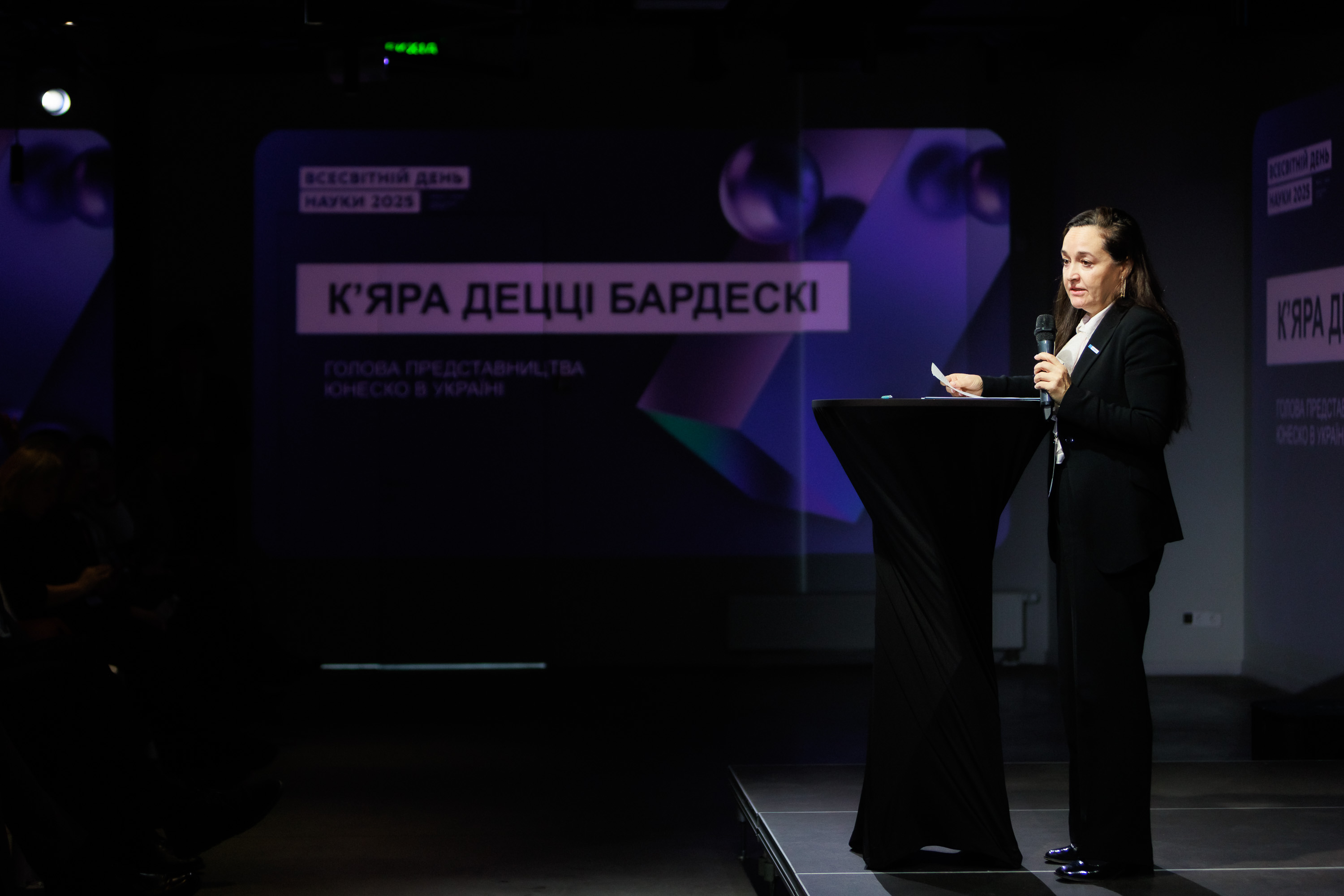 Голова Представництва ЮНЕСКО в Україні К’яра ДЕЦЦІ БАРДЕСКІ підкреслила роль науки як рушія сталого розвитку, наголосивши на важливості міжнародної співпраці, обміну знаннями та підтримки молодих учених.