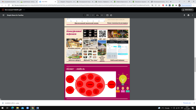 Під керівництвом доктора економічних наук, завідувача кафедри готельно-ресторанної справи та туризму Інни Левицької, студенткою було розроблено та представлено Start-up проект «Eco-casual restaurant – за інноваціями майбутнє», що включає в себе концепцію, бренд-бук, прогноз завантаження закладу, дослідження ринку споживачів, конкурентні переваги, бізнес-модель, фінансові показник та етапи реалізації.