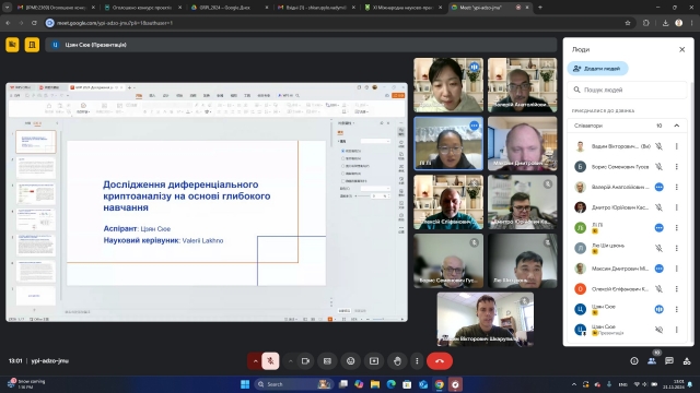 Виступи супроводжувалися запитаннями, дискусіями. Найбільшу зацікавленість викликала доповідь аспірантки Цзян Сюе (науковий керівник Валерій ЛАХНО) на тему «Дослідження диференціального криптоаналізу на основі глибокого навчання».