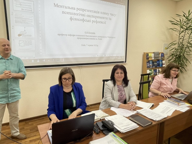 Наукову доповідь за темою «Ментальна репрезентація плину часу: психологічні експерименти та філософські рефлексії» представ професор кафедри психології Олексій Полунін. В його дослідній роботі були представлені аргументи щодо здатності когнітивної системи продукувати не одну, а кілька репрезентацій плину часу; історична перспектива і погляд з теперішнього на питання про те скільки репрезентацій плину часу когнітивна система здатна продукувати; релевантність ідеї про множинність ментальних репрезентацій плину часу для окремих досліджень в когнітивістиці і філософії.