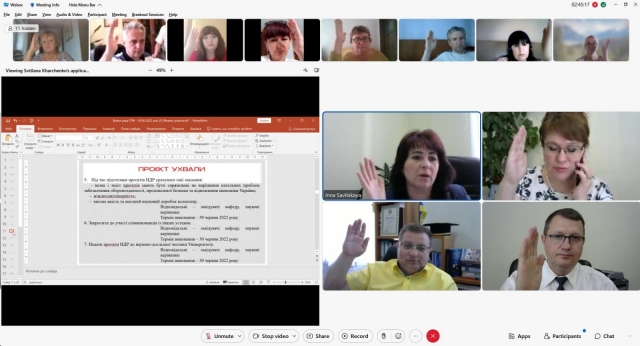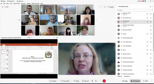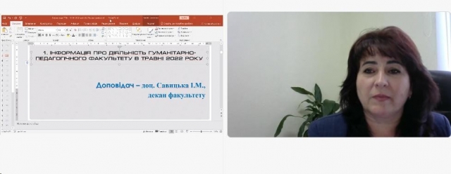 Голова Вченої ради Інна Савицька розпочала онлайнове засідання з надання інформації про діяльність гуманітарно-педагогічного факультету в травні 2022 року в умовах воєнного стану, який продовжує вносити свої корективи у життєдіяльність факультету, поряд з цим науково-педагогічний колектив виконує поставлені завдання в аспектах навчальної, міжнародної, наукової та виховної роботи. Декан факультету акцентувала увагу членів ученої ради на плідній роботі науково-педагогічних працівників гуманітарно-педагогічного факультету, які провели у травні 2022 року низку заходів, зокрема: День відкритих дверей, зустріч зі вступниками до магістратури, цикл майстер-класів із написання мотиваційного листа та підготовки до НМТ абітурієнтів (кафедра соціальної роботи та реабілітації, кафедра журналістики та мовної комунікації, кафедра міжнародних відносин і суспільних наук), спільний онлайн захід із роботодавцями до Дня захисту дітей (кафедра соціальної роботи та реабілітації) тощо. З метою активізації міжнародної наукової співпраці з провідними зарубіжними вченими й фахівцями та популяризації наукових досліджень Університету було проведено такі наукові заходи в онлайн форматі: ІІІ Міжнародна міждисциплінарна науково-практична конференція «Мова, бізнес і право, міжкультурна комунікація: виклики сьогодення», ІІІ Міжнародна міждисциплінарна конференція «Фахові мови й новітні підходи до їх викладання» (LSP 2022) (кафедра іноземної філології і перекладу); ювілейні Х-ті Сковородинські навчання: Всеукраїнський науково-практичний онлайн-семінар «Роль і значення людини в трансформації соціальних практик: минуле і сучасність» (кафедра філософії та міжнародної комунікації); V Міжнародна науково-практична студентська конференція «Світ мов і мови світу» (кафедра романо-германських мов і перекладу); I Всеукраїнська студентська науково-практична конференція «Сучасні тенденції в медіагалузі» (кафедра журналістики та мовної комунікації); Міжнародна науково-практична конференція «Відносини між Україною і НАТО на сучасному етапі: досягнення та виклики» (кафедра міжнародних відносин і суспільних наук); студентська науково-практична конференція «Сучасна студентська наука як основа майбутнього потенціалу української нації» (кафедра управління та освітніх технологій).