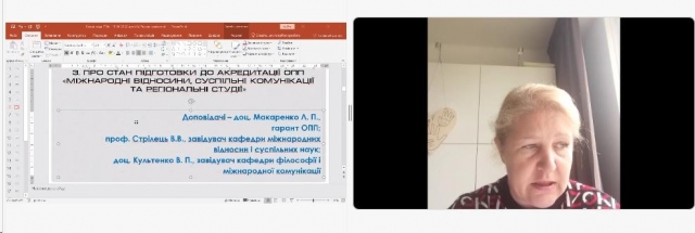 Гарант ОПП «Міжнародні відносини, суспільні комунікації та регіональні студії», доцент кафедри міжнародних відносин і суспільних наук Лілія Макаренко, завідувач кафедри міжнародних відносин і суспільних наук, професор Василь Стрілець та завідувач кафедри філософії та міжнародної комунікації Валентина Культенко прозвітували щодо приведення ОПП «Міжнародні відносини, суспільні комунікації та регіональні студії» ОС «Магістр» у відповідність до Критеріїв акредитаційної експертизи та представили унікальність ОПП. Заступник декана, професор Світлана Харченко та завідувач кафедри соціальної роботи та реабілітації, професор Ірина Сопівник закцентували увагу на актуальності уміщених у звіті про самоаналіз покликань та на розміщенні необхідних матеріалів на сайтах кафедр.