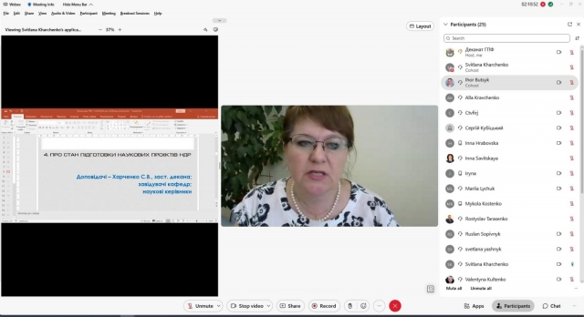 Завідувачі кафедр та наукові керівники прозвітували про стан підготовки наукових проєктів НДР. Заступника декана, професор Світлана Харченко зауважила, що під час підготовки проєктів НДР необхідно врахувати такі завдання: назва і зміст проєктів мають бути спрямовані на вирішення нагальних проблем забезпечення обороноздатності, продовольчої безпеки та відновлення економіки України; міждисциплінарність; високу якість та високий науковий доробок колективу та надала рекомендацію запросити до участі співвиконавців із інших установ.