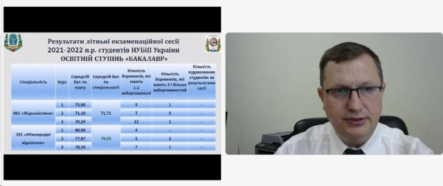 Заступник декана, доцент Вадим Овчаренко доповів про підсумки літньої заліково-екзаменаційної сесії 2021/2022 навчального року та наголосив на необхідності зосередження уваги завідувачів випускових кафедр та наставників академічних груп на необхідності підвищення відповідальності у роботі зі студентами; посилення контролю за виконанням умов договорів; проведенні бесіди зі студентами груп.