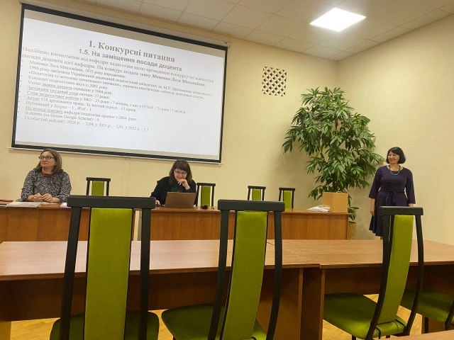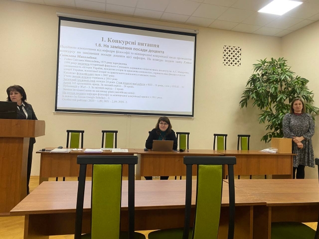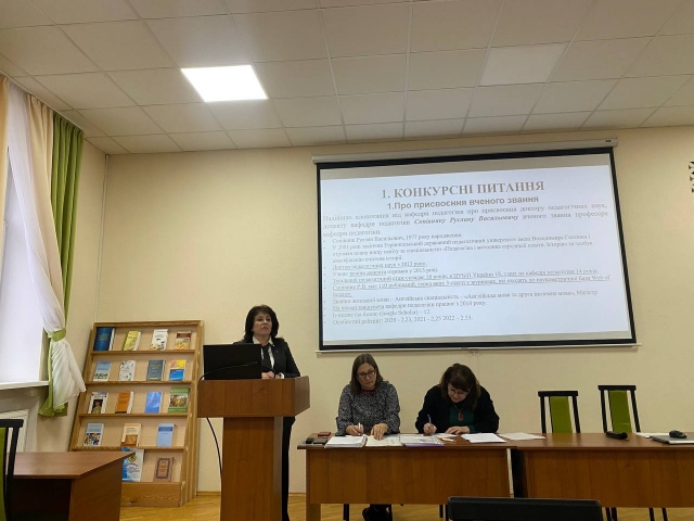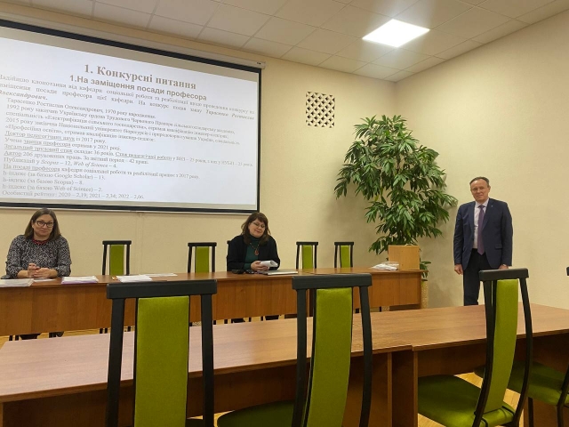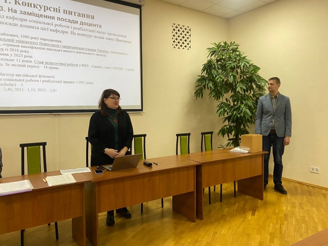 На порядок денний були винесені конкурсні питання. Шляхом таємного голосування вчена рада підтримала рекомендацію кафедри педагогіки про присвоєння Руслану Сопівнику вченого звання професора кафедри педагогіки, а також рекомендації кафедр і підтримала кандидатури Ростислава Тарасенка на заміщення посади професора кафедри соціальної роботи на реабілітації; Оксани Витриховської та Олександра Прохорчука на заміщення посади доцента цієї кафедри, Світлани Виговської та Лесі Маценко – посаду доцента кафедри педагогіки, Світлани Гейко та Олени Лаути – посаду доцента кафедри філософії та міжнародної комунікації, Вікторії Хвіст – посаду доцента кафедри міжнародних відносин і суспільних наук; Сергія Вербицького – на заміщення посади старшого викладача кафедри фізичної культури, Ольги Сироєжко – на заміщення посади асистента кафедри педагогіки.