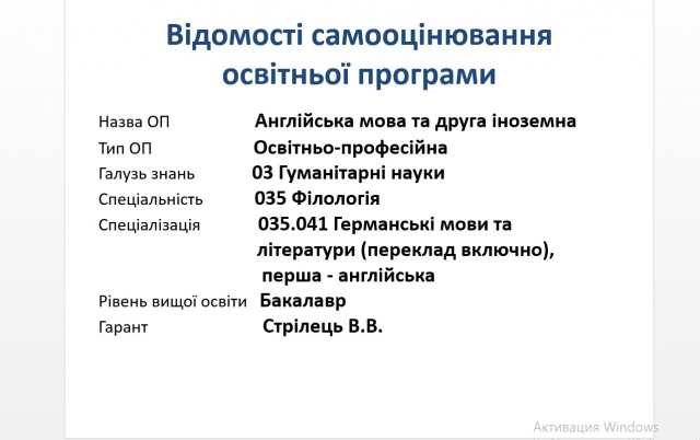 Про стан підготовки відомостей самоаналізу ОП «Філологія (англ.)», «Філологія (нім.)», «Фізична культура і спорт» на засіданні вченої ради доповідали гаранти ОП та завідувачі кафедр. Валентина Стрілець, кандидат пед. наук, доцент, гарант освітньої програми «Англійська мова та друга іноземна» представила самооцінювання даної ОП. Визначила мету, основний фокус, особливість, також досягнення результатів навчання, визначених стандартом вищої освіти, детально розкрила забезпечення унікальності ОП.