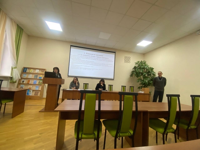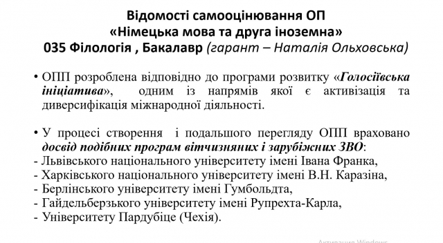 Наталія Ольховська, кандидат філол. наук, доцент, гарант освітньої програми «Німецька мова та друга іноземна» представила відомості самооцінювання освітньої програми, яка розроблена відповідно до програми розвитку «Голосіївська ініціатива». В процесі її створення і подальшого перегляду було враховано досвід подібних програм вітчизняних і зарубіжних ЗВО. Наталія Семенівна представила мету, особливість, цілі, зміст та структуру, також досягнення результатів навчання, детально розкрила сильні сторони ОП «Німецька мова та друга іноземна».