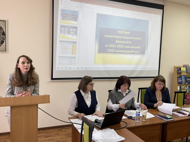 Стрижневе питання порядку денному вченої ради гуманітарно-педагогічного факультету, що відбулася 16 лютого 2023 року, – результати рейтингового оцінювання якості роботи НПП факультету у 2021/2022 н. р. і 2022 р. У своїй доповіді секретар рейтингової комісії гуманітарно-педагогічного факультету доцент Олена Балалаєва проаналізувала рейтингові показники як кафедр, так індивідуальні викладачів, особливості динаміки рейтингу порівняно з минулим роком. Результати рейтингу досить чітко відбивають пріоритети, які ми маємо. Це є підставою для ґрунтовного аналізу діяльності, послідовної реалізації стратегії гармонійного розвитку гуманітарно-педагогічного факультету, вирівнювання ситуації з окремими видами робіт, консолідації зусиль всіх НПП щодо активізації роботи, яка ґрунтується на критеріях дослідницького університету, а також навчально-науково-інноваційної та міжнародної діяльності.