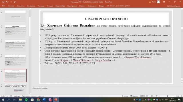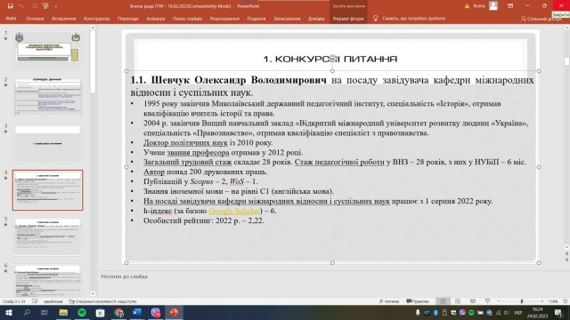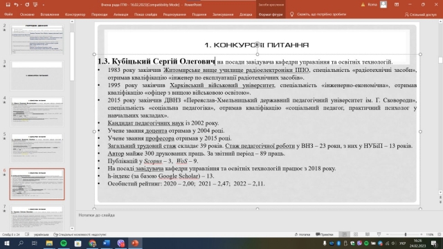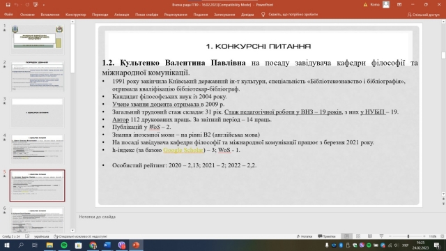 Відповідно до порядку денного на розгляд ученої ради були винесені конкурсні питання. Таємним голосування вчена рада підтримала рекомендації кафедр і рекомендувала вченій раді університету кандидатуру Валентини Культенко на посади завідувача кафедри філософії та міжнародної комунікації, Сергія Кубіцького ‒ кафедри управління та освітніх технологій, Олександра Шевчука ‒ кафедри міжнародних відносин і суспільних наук.