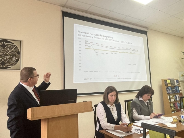 Заступник декана гуманітарно-педагогічного факультету професор Ігор Буцик доповів про стан організації змішаного навчання на гуманітарно-педагогічному факультеті в кризових умовах. Були проаналізовані наступні питання: відвідування навчальних занять студентами 1, 2, 3 та 4 курсів; чисельність студентів на заняттях у 2 семестрі 2020/2021 у порівнянні з 2 семестром 2021/2022 н.р.; використання ЕНК в навчальному процесі та показник атестованих ЕНК, який збільшився у 2022 р.