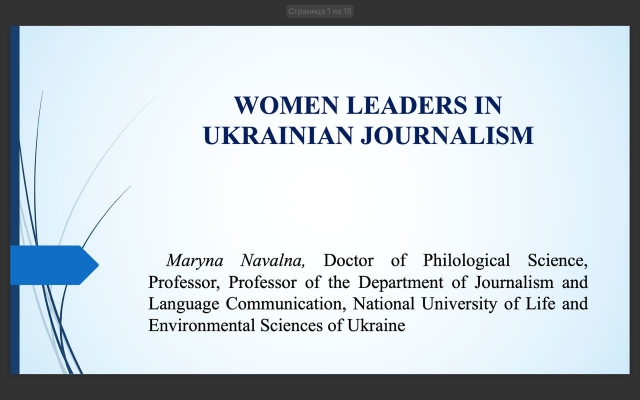 У доповіді англійською мовою професорка подала останні дослідження громадської організації «Жінки в медіа» за підтримки IFES Україна та Урядової уповноваженої з питань гендерної політики України. Дослідження виявили, що жінки становлять більшість у керівних органах редакцій, а серед власників медіа переважають чоловіки.