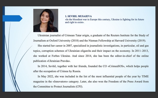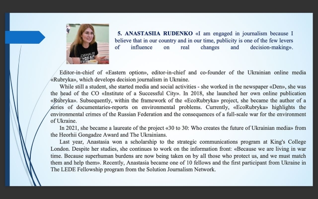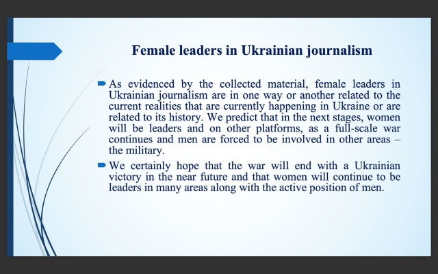 Крім соціологічної інформації, подано найвідоміших жінок-керівників українських медіа. Професорка представила діяльність та видатні досягнення жінок-медійників: Севгіль Мусаєвої, Анни Бабінець, Ольги Руденко, Ірини Цілик, Анастасії Руденко, Наталії Седлецької, Ольги Токарюк, Аліси Коваленко.