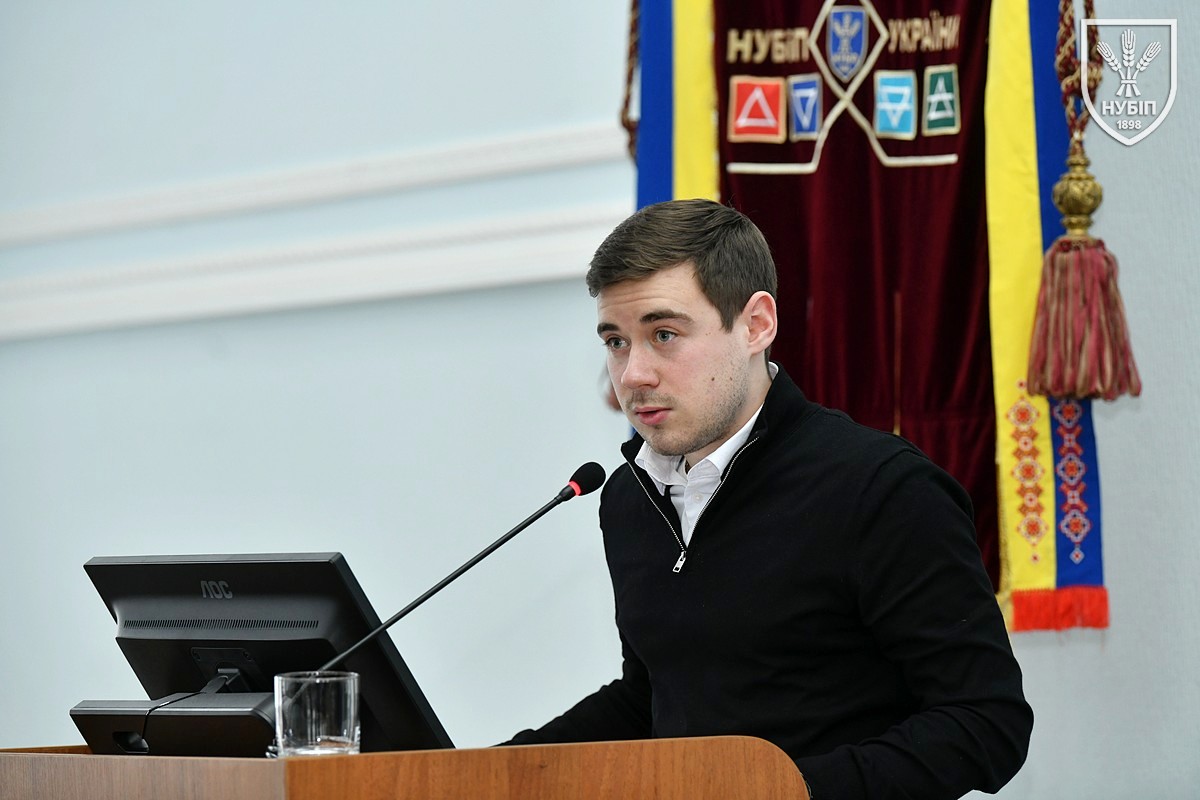 Заступник генерального директора Українського клубу аграрного бізнесу Максим ГОПКА присвятив виступ аналітиці українського сільськогосподарського виробництва та його місцю в структурі глобальної торгівлі. Грунтовно доповідач зупинився на питаннях євроінтеграції, викликах, які пов’язані з цим процесом та ролі аграрної освіти і науки.