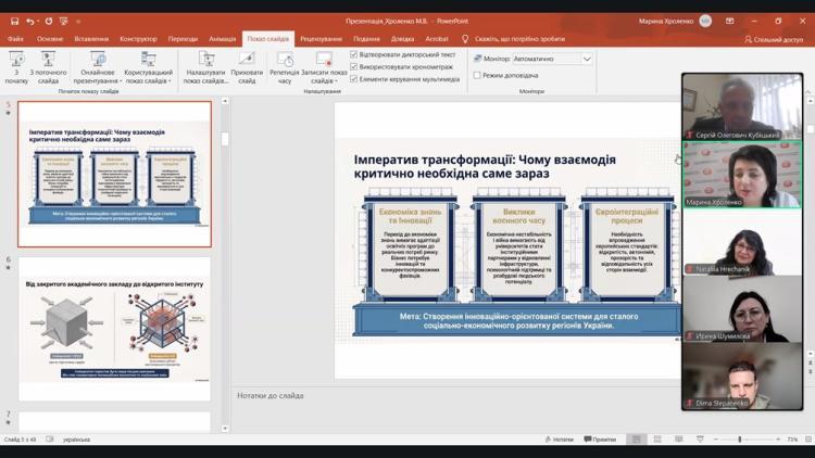 У своєму виступі Марина Володимирівна переконливо продемонструвала, що сучасний університет трансформується у відкриту інституцію, яка активно взаємодіє з бізнесом і громадами, формуючи нову якість освітнього процесу та забезпечуючи розвиток регіонів. Особливий акцент було зроблено на формуванні партнерських екосистем та реалізації моделі «освіта – наука – інновації», що визначає стратегічні орієнтири розвитку управлінських програм.