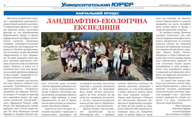 З метою набуття у студентів знань з ландшафтних видозмін в процесі їхньої еволюції та в результаті антропогенної діяльності, а також з вивчення впливу екологічних факторів на стан функціонування біорізноманіття (флори та фауни) науково-педагогічними працівниками кафедри екології агросфери та екологічного контролю 8 вересня 2023 року була організована ландшафтно-екологічна експедиція для студентів 3 курсу спеціальності 101 «Екологія», які в цей період навчання вивчають дані питання в розрізі дисципліни «Біорізноманіття та його збереження». На думку викладачів кафедри, немає кращого засвоєння теоретичного матеріалу студентами, а ніж той, аспекти якого студенти можуть побачити на власні очі та запам’ятати його. Саме тому, програма експедиції передбачала відвідування двох локацій (природний ландшафт, техногенно-змінений ландшафт).