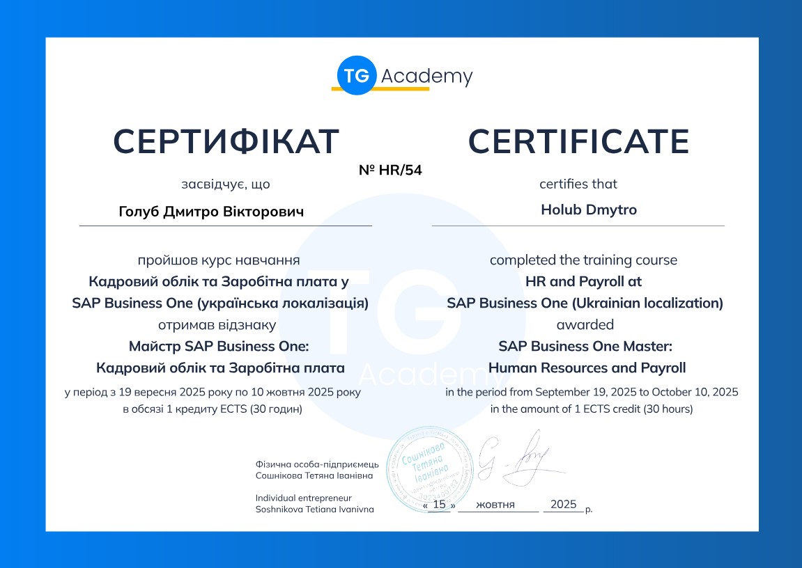 Успішне завершення курсу «Зарплата і кадри у SAP Business One»: сертифікат рівня "Майстер" знайшов свого власника!
