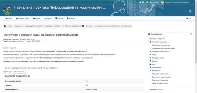 Так як навчальна практика починається в дистаційному форматі, в електронному навчальному курсі створено ресур в якому студенти можуть переглядати запис інструктажу з охорони праці та техніки безпеки і розмістити листи-підтвердження прослуховування інструктажу.