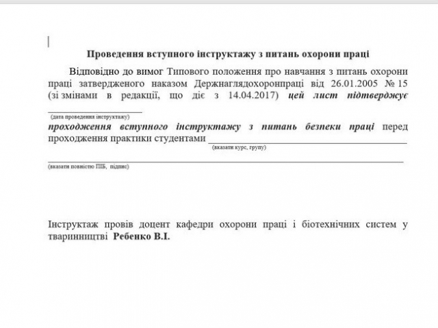 Навчальна практика розпочалася з проведення інструктажу з охорони праці та техніки безпеки під час проходження практичного навчання у змішаному форматі проведеного доцентом кафедри охорони праці та біотехнічних систем у тваринництві ‒ Віктором Ребенко.