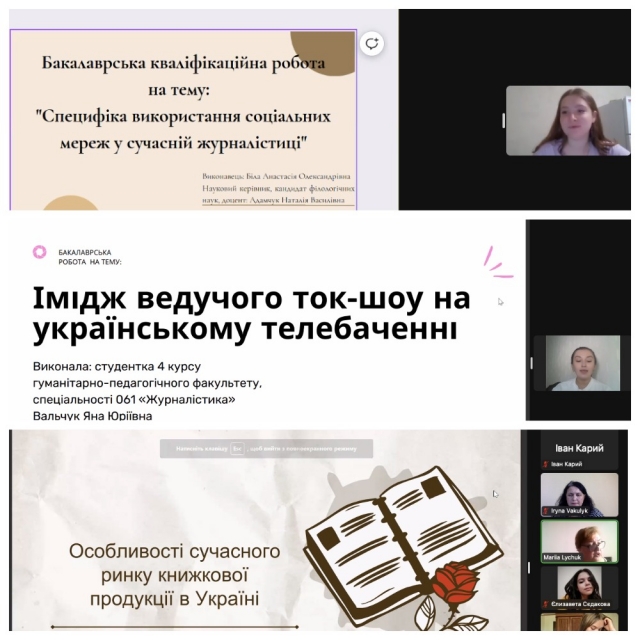 День відкритих дверей із неймовірною кількістю гостей, швидко подолані міжфакультетські лабіринти за допомогою дорожніх карт і неприховані позитивні емоції майбутніх абітурієнтів від розгаданих квестів, успішно складена сесія, двотижнева практика у сучасній медіалабораторії, де монтувались відео святкування 125 річниці нашого університету і готувались матеріали для захисту випускових робіт, – здавалося, вже позаду і можна видихнути на повні груди. Проте останній ривок все ж довелося зробити. Це насичений триденний ДЕК, у якому час немовби уповільнився завдяки злагодженій роботі комісії під головуванням Марії Личук, професора кафедри романо-германських мов і перекладу, а також професорів кафедри журналістики та мовної комунікації Марини Навальної, Тетяни Семашко, Миколи Степаненка.