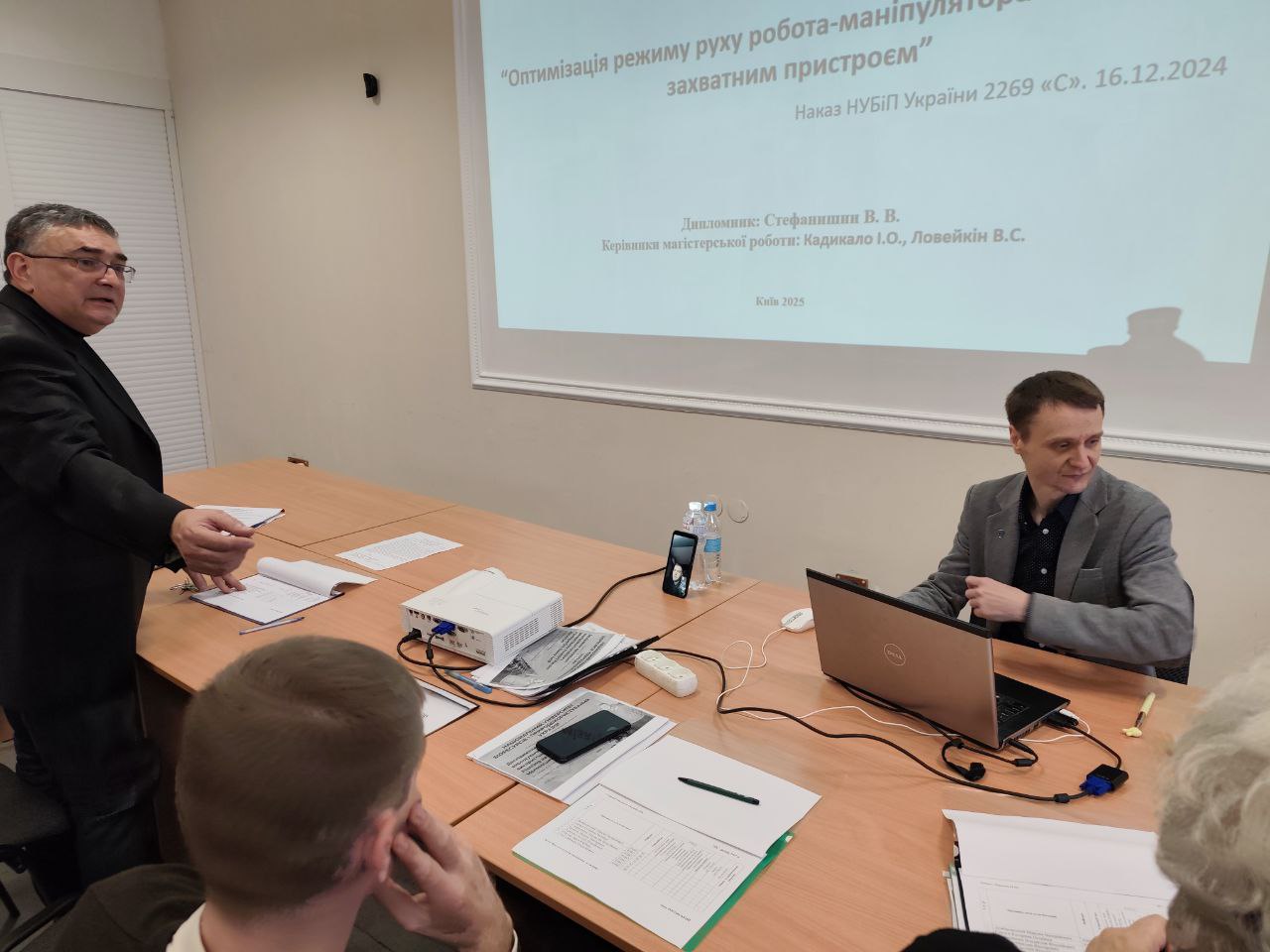 Після оголошення оцінок голова екзаменаційної комісії проф. Костянтин ЛОПАТЬКО, декан факультету конструювання та дизайну проф. Іван РОГОВСЬКИЙ та гарант ОПП проф. Юрій РОМАСЕВИЧ привітали здобувачів із успішним захистом та побажали їм подальших професійних досягнень для розвитку актуального та сучасного напрямку – роботизації сільськогосподарського виробництва.