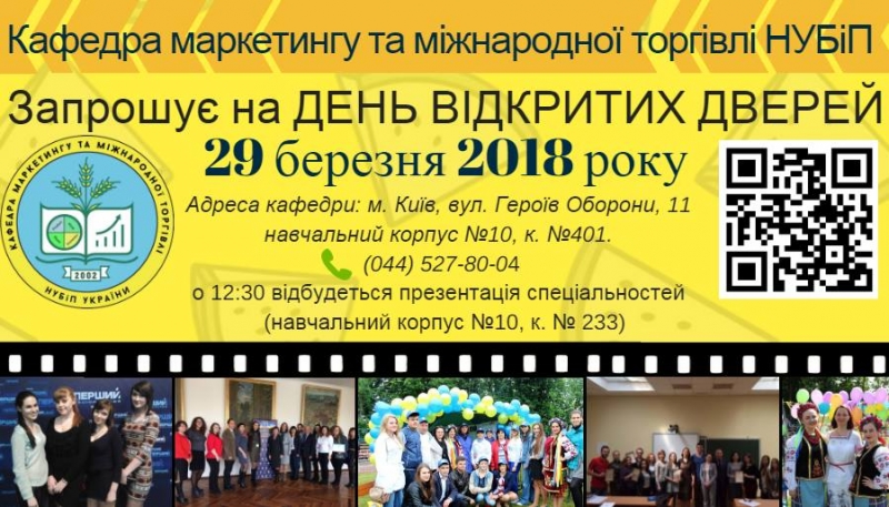 29 березня 2018 року кафедра маркетингу та міжнародної торгівлі і факультету аграрного менеджменту НУБіП України запрошують учнів старших класів, батьків, випускників освітного ступеня - молодший спеціаліст та бакалавр, а також всіх бажаючих на День Відкритих Дверей!