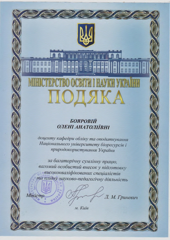 За багаторічну сумлінну працю, вагомий особистий внесок у розвиток сфери освіти і науки, високий професіоналізм та сумлінне виконання службових обов’язків Подякою Міністерства освіти і науки України нагороджено нашу колегу, доцента кафедри обліку та оподаткування Олену Боярову.
