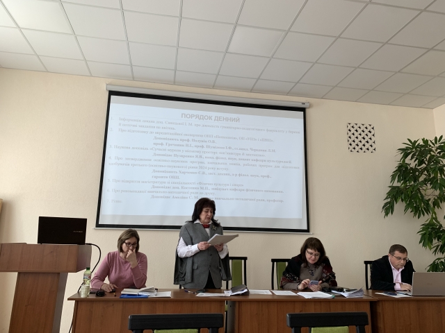 На початку засідання голова вченої ради Інна Савицька традиційно узагальнила результати роботи факультету за місяць і звернула увагу членів вченої ради та присутніх на поточні завдання, які стоять перед колективом, наголосивши на якісному наданні освітніх послуг відповідно до навчальних планів реалізації освітніх програм (з 1 квітня 3 курс виходить на очне навчання; 15 квітня – початок сесії у студентів 4 курсу). Окрім того, безумовним є реагування на сигнали повітряної тривоги.