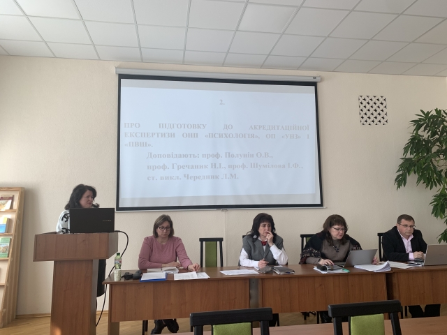 Стрижневим питанням ученої ради стало питання про підготовку до акредитаційної експертизи ОНП «Психологія» та «Управління навчальними закладами», ОПП «Управління навчальними закладами» та «Педагогіка вищої школи». На засіданні вченої ради доповідали гаранти ОНП та ОНП, завідувачі відповідних кафедр. Ірина Мартинюк, кандидат психол. наук, доцент, завідувачка кафедри психології представила підготовку до акредитаційної експертизи ОНП «Психологія». Визначила мету, основний фокус, особливість, також досягнення результатів навчання, визначених стандартом вищої освіти, детально розкрила забезпечення унікальності ОНП.