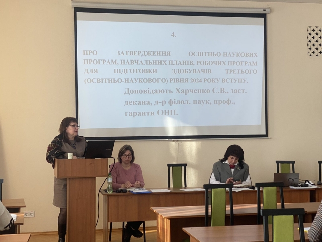 Заступник декана з наукової роботи Світлана Харченко представила інформацію про затвердження освітньо-наукових програм, навчальних планів, робочих програм для підготовки здобувачів третього (освітньо-наукового) рівня 2024 року вступу. Після представленої інформації члени ученої ради одноголосно їх затвердили.