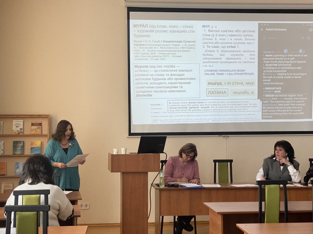 З науковою доповіддю «Сучасні мурали у міському просторі – кон’юнктура vs мистецтво» виступила доцент кафедри культурології Ярина Пузиренко. В її дослідній роботі зосереджена увага на проблемних питаннях, пов’язаних з муралами у міському просторі. Як показало проведене дослідження, потребують подальшого опрацювання теоретичні питання визначення муралів як виду монументального живопису та їхніх стильових особливостей та художньої цінності. Щодо практичних аспектів створення та функціонування муралів у міському просторі, то одними з найголовніших є питання їхнього змістового спрямування. Творці муралів мають враховувати психологічні аспекти сприйняття зображень. Те що доцільне у виставкових та музейних залах не завжди прийнятне як постійна експозиція, яку щодня бачить значна кількість містян незалежно від свого бажання. Для регулювання цієї проблеми у Києві буде створена спеціальна комісія, яка погоджуватиме ескізи та локації розміщення монументальних розписів.