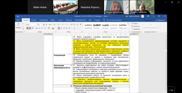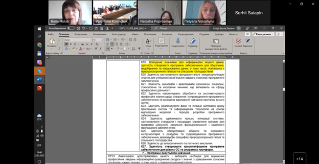 Спеціальність 121 «Інженерія програмного забезпечення» забезпечує підготовку кафедра комп'ютерних наук, гарант освітньої програми завідувач кафедри доцент Белла Голуб. Запропоновано доповнити К19 «…у тому числі пов’язаних з природоохоронною галуззю та сільським господарством» та К27 пропонується у наступній редакції: « Здатність створювати кросплатформне програмне забезпечення для різних ОС та апаратних платформ».