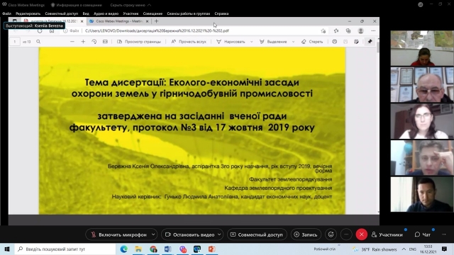 Вчена рада факультету землевпорядкування: наукова доповідь аспіранта Ксенії Бережної та питання підвищення якості проведення занять під час дистанційного та змішаного навчання на факультеті