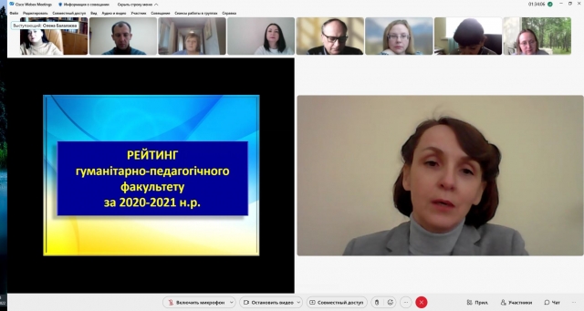 Секретар рейтингової комісії гуманітарно-педагогічного факультету, доцент Олена Балалаєва доповіла про результати рейтингового оцінювання якості роботи НПП факультету у 2020/2021 н. р. та розглянула динаміку рейтингу порівняно з минулим роком. Результати рейтингу досить чітко відбивають пріоритети, які ми маємо. Це є підставою для ґрунтовного аналізу діяльності, послідовної реалізації стратегії гармонійного розвитку гуманітарно-педагогічного факультету, вирівнювання ситуації з окремими видами робіт, консолідації зусиль всіх НПП щодо активізації роботи, яка ґрунтується на критеріях дослідницького університету, а також навчально-науково-інноваційної та міжнародної діяльності.