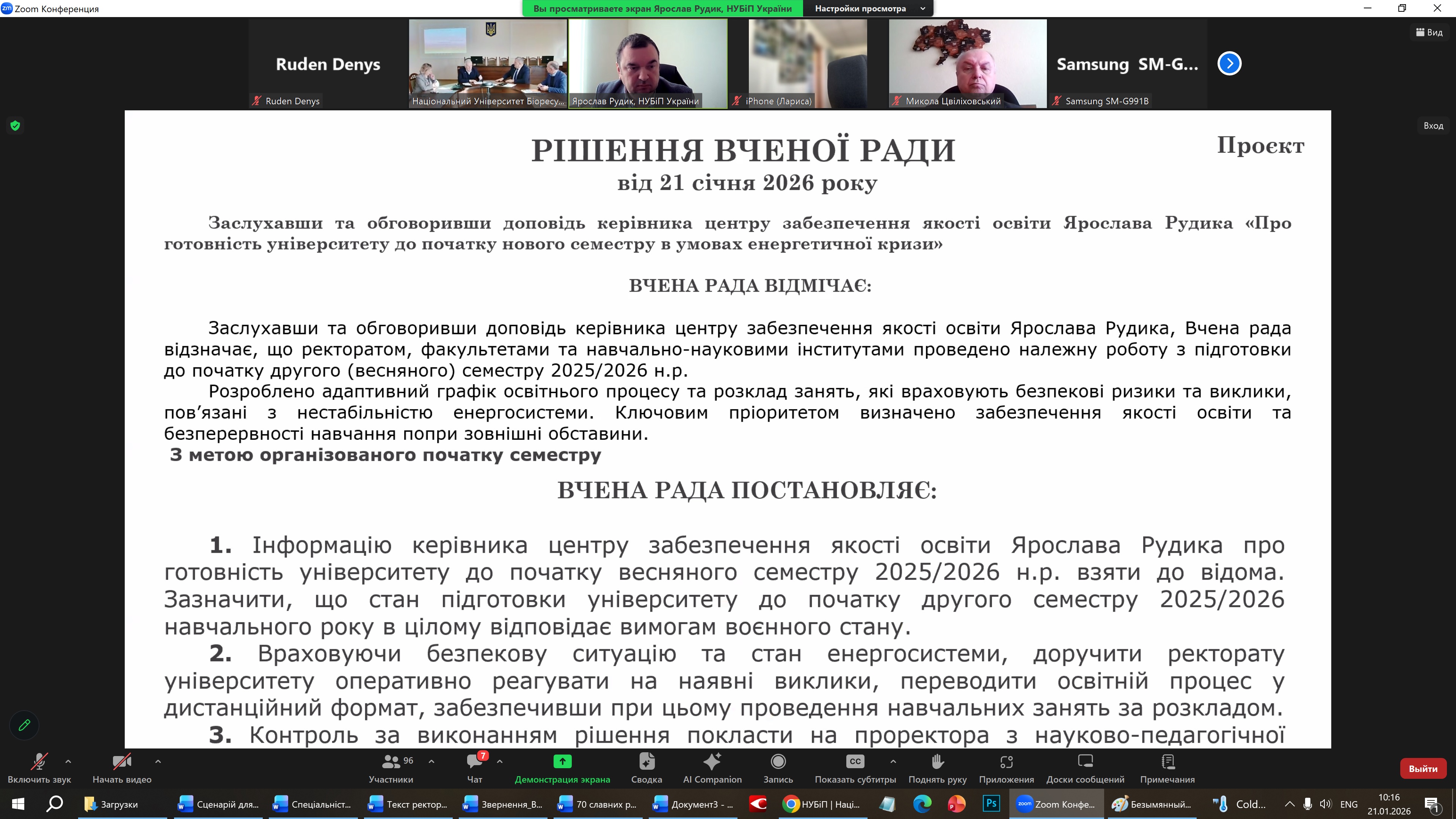 21 січня 2026 року відбулося позачергове засідання вченої ради університету в онлайн форматі. Відкриваючи засідання голова вченої ради, президент університету Станіслав НІКОЛАЄНКО закцентував на необхідності розглянути нагальні питання життєдіяльності вишу та прийняти необхідні рішення.