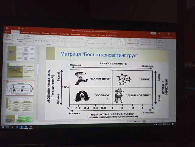 Згідно навчальної програми з дисципліни «Маркетинговий аналіз», студенти дистанційно мали провести комплексний аналіз ринку та маркетинговий аналіз підприємств. Для вивчення необхідного матеріалу використовували навчальну платформу Elearn. Раз у тиждень за розкладом, проводилися зустрічі в онлайн-сервісі Zoom для більш детального освоєння інформації та спілкування з викладачем стосовно навчального матеріалу. Для постійного зв’язку з студентами використовувалися Viber та E-mail. Для нашого покоління такий досвід буде безцінним.