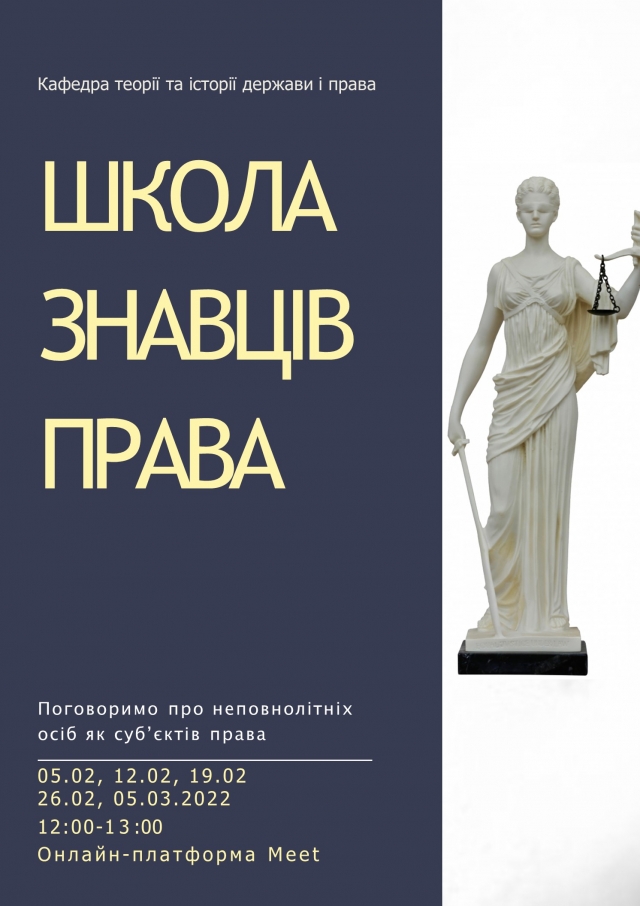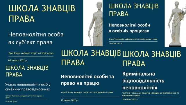 Цього тижня кафедра теорії та історії держави і права завершила весняну сесію онлайн-вебінарів, проведених у рамках просвітницького проєкту «Школа знавців права». Протягом п’яти тижнів, які, на жаль, в умовах воєнного стану розтягнулися на пару місяців, учасники та учасниці, які виявили бажання доєднатися до його роботи, кожної суботи, починаючи з 05 лютого 2022 року приєднувалися за покликаннями до онлайн-зустрічей, щоб прослухати особливості правового регулювання суспільних відносин за участю неповнолітніх осіб.