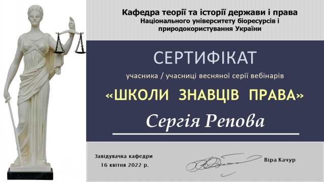 Тож вітаємо усіх учасників та учасниць з успішним завершенням весняної сесії вебінарів просвітницького проєкту кафедри «Школа знавців права» 2022 року, а також чекаємо усіх бажаючих на наступних зустрічах!