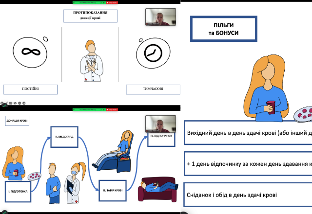 Перший вебінар був присвячений донорству крові, тему якого розкривала Анна МЕЛЬНИК – практичуюча адвокатеса та неодноразовий донор крові. Вона розповіла про права та обов’язки донорів крові, нормативно-правову базу, яка регулює цей процес, а також про юридичні гарантії для донорів в Україні. Учасники вебінару дізналися про те, як правильно оформлювати донорство, хто може бути донором, а також про важливість донорства в контексті національної безпеки та здоров’я громадян.