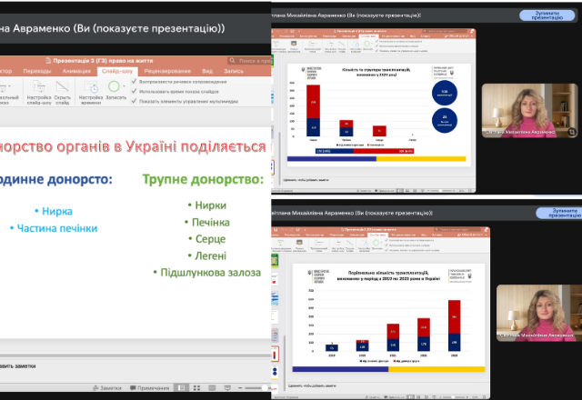 Другий вебінар, присвячений донорству органів, був проведений Світланою АВРАМЕНКО – практикуючою адвокатесою, кандидаткою юридичних наук. Вона поділилася зі слухачами важливою інформацією про законодавчі аспекти трансплантації органів в Україні, а також обговорила етичні питання, які постають у цьому процесі. Особливу увагу Світлана Авраменко звернула на правовий статус донорів органів та процеси згоди на трансплантацію.