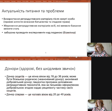 Третій вебінар був присвячений донорству репродуктивного матеріалу, і його спікеркою стала Олена ЧОМАХАШВІЛІ, доцентка, практикуюча юристка. У цьому вебінарі обговорювалися правові аспекти, пов'язані з донорством сперми та яйцеклітин, регулювання цього процесу в Україні та країнах ЄС. Олена Чомахашвілі розкрила питання, що стосуються анонімності донорів, їх правових гарантій та вимог до медичних закладів, які займаються репродуктивними технологіями. Спікерка акцентувала увагу на анонімності донорів та вимогах до медичних установ, що займаються репродуктивними технологіями.