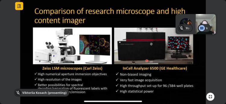 Вікторія Романівна поділилася власним досвідом роботи з флуоресцентною мікроскопією. Здобувачі мали змогу ознайомитися з реальними прикладами з дослідницької та індустріальної практики, а також з вимогами до підготовки фахівців та очікуваннями роботодавців щодо професійних компетентностей майбутніх кандидатів на посади сучасного біотехнологічного ринку праці.