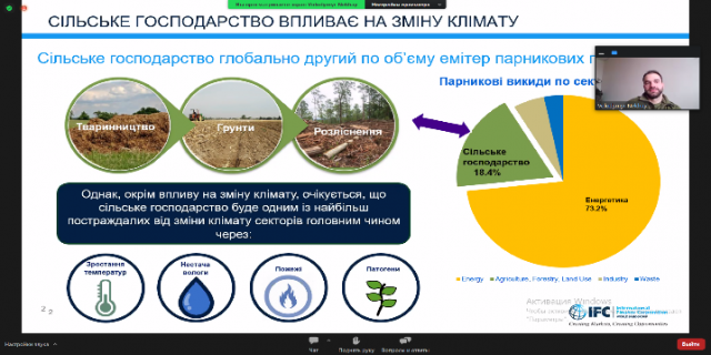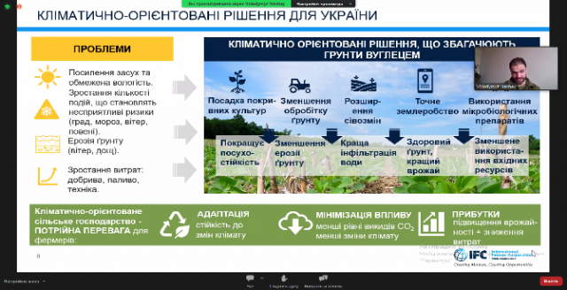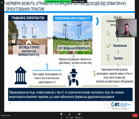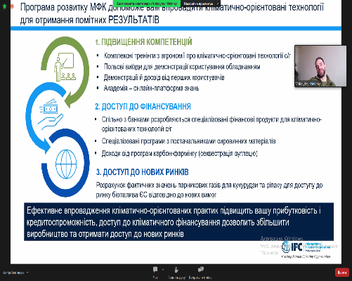 Розповів про програму розвитку МФК, яка допоможе ефективному впровадженню кліматично-орієнтованих практик, що підвищать прибутковість і кредитостпроможність, а доступ до кліматичного фінансування дозволить збільшити виробництво та отримати доступ до нових ринків. При кінці зустрічі блок «Питання-відповіді». Зустріч була цікавою, інформаційно насиченою.
