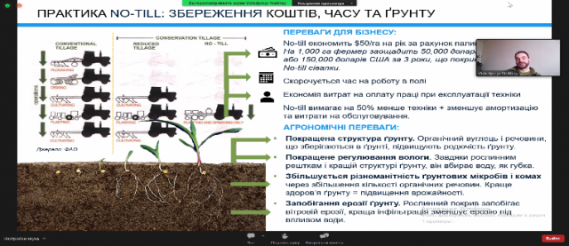 У своєму виступі він надав інформацію про те, як зміна клімату впливає на сільське господарство, як сам аграрний сектор залежить від клімату. Він зазначив, що за підвищення температури на 2°С кліматичні пояси змістилися на 200 км на північ. На слайдах він продемонстрував, як збільшуються втрати у виробничому процесі через зміну клімату, як відбувається деградація ґрунтів, а також наголосив на шляху подолання впливу зміни клімату на сільське господарство. Він зосередився на нових технологіях, які дозволяють знизити вплив зміни клімату, таких як NO-TILL: економія грошей, часу та ґрунту. У своєму виступі він звернув увагу на покривні культури, які слід включати в сівозміну, що уповільнюють ерозію, покращують стан ґрунту, підвищують водозабезпеченість.