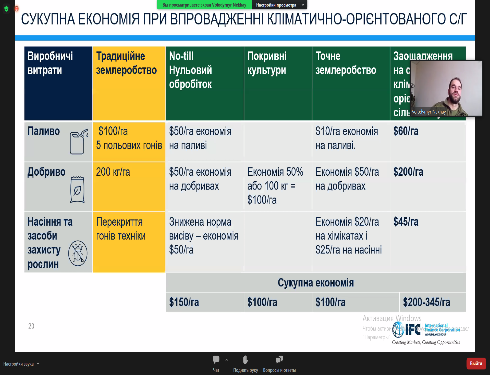 А також звернув увагу на економічну складову землеробства та підвищення рентабельності. Продемонстрував як зростання цін на сировинні ресурси ставить під загрозу прибутковість сільського господарства. Показав розрахунки сукупної економії при впровадженні кліматично-орієнтованого господарства.