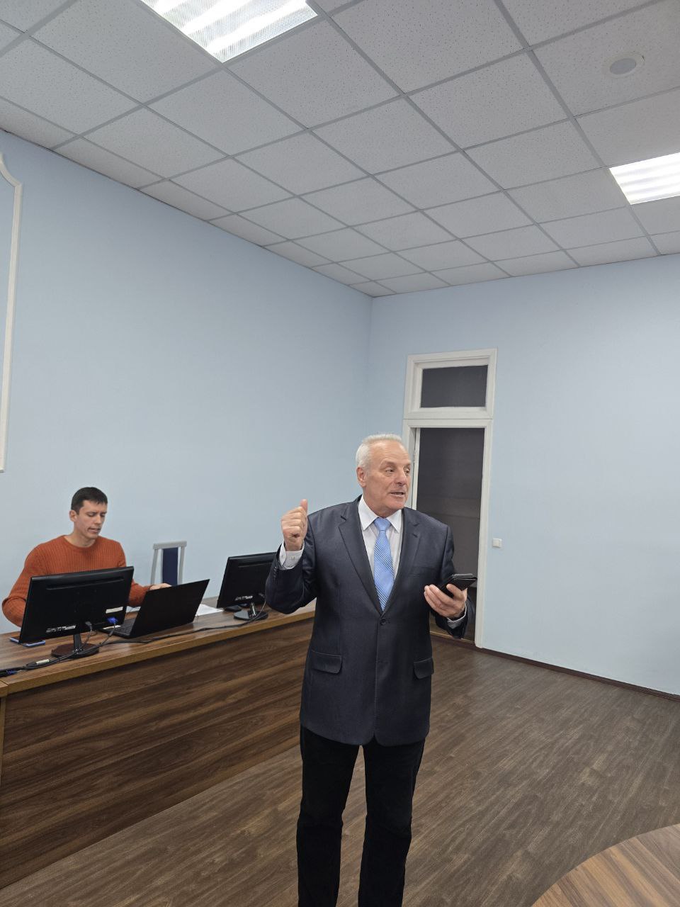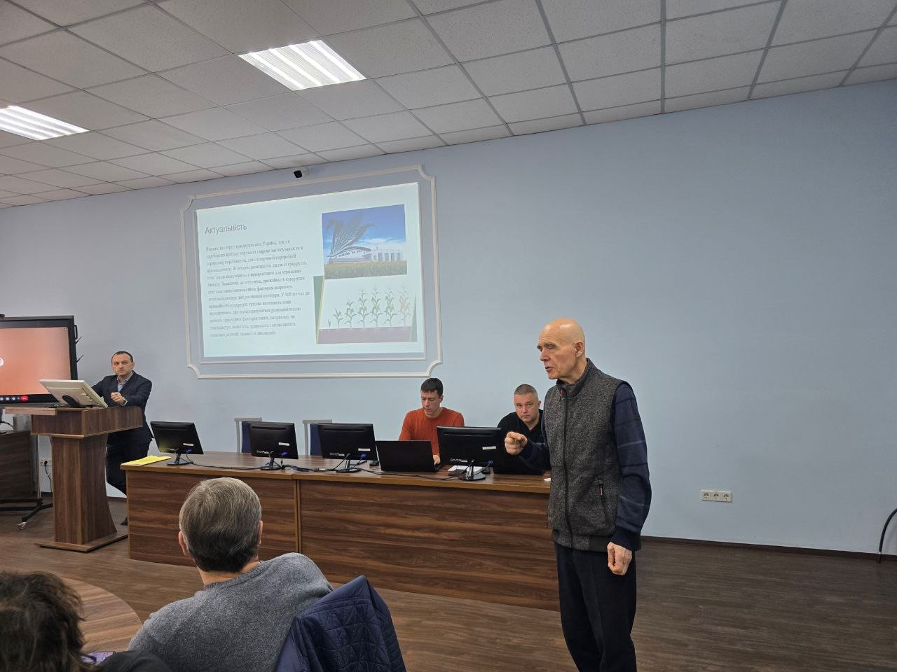 Далі виступив колектив доповідачів: професор Віталій Пилипович ЛИСЕНКО, професор кафедри комп'ютерних систем, мереж та кібербезпеки; Тарас ЛЕНДЄЛ, кафедра автоматики і робототехнічних систем ім. акад. І.І. Мартиненка; Микола ДОЛЯ. Виконано доповідь на тему «Прогнозування врожайності та якості посівів кукурудзи для степової зони України».