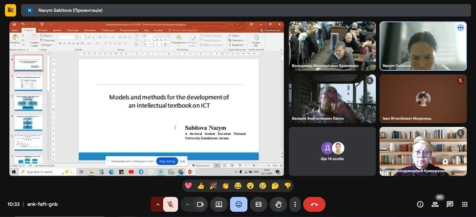 Першим доповідачем у межах пленарної частини була Nazym Sabitova, Doctoral student in the specialty 8D06102 – Computer Science at L.N., Gumilyov Eurasian National University (Astana, Kazakhstan). Тема доповіді: «Methods and Models of an Intelligent Textbook on ICT».