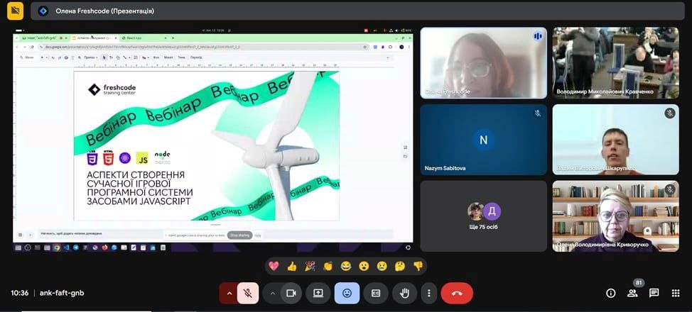 Наступним запрошеним доповідачем була представниця корпоративного сектору – пані Олена ЗДАНОВСЬКА, fullstack JS-розробниця міжнародної IT-компанії Freshcode (https://www.freshcodeit.jobs/). Проведено доповідь на тему «Аспекти створення сучасної ігрової програмної системи засобами JavaScript».
