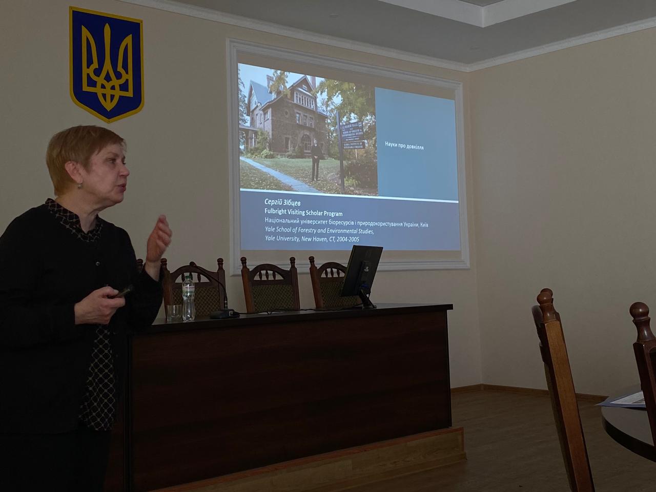 Спікеркою заходу виступила заступниця директора та програмна координаторка програм для студентів і молодих науковців Інна БАРИШ. Вона запросила до слова фіналіста програми Фулбрайта від НУБіП – Віктора МИРОНЮКА, професора кафедри таксації та лісового менеджменту, який поділився власним досвідом участі у програмі. У своєму виступі він розповів про процес підготовки до стажування, важливість чіткої мотивації та розуміння мети поїздки, а також про практичні аспекти участі у програмі – пошук приймаючого університету, погодження теми дослідження, організацію проживання та планування наукової роботи протягом дев’ятимісячного стажування. Особливу увагу він приділив значенню встановлення професійних контактів та довгострокової співпраці, наголосивши, що програма Фулбрайта є не лише науковим, а й культурним обміном, який сприяє налагодженню міцних зв'язків між Україною та США.