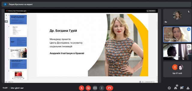 Богдана Гурій, кандидат соціологічних наук, керівник проектів Центру дослідження та розвитку соціальних інновацій Єзуїтського університету філософії і освіти Академії «Ignatianum» (м. Краків, Республіка Польща) спрезентувала авторський онлайн-курс «Польська мова для початкового та середнього рівнів» як інструмент мовної та соціальної інтеграції. Основна мета цього проекту – створення інноваційного онлайн-курсу з вивчення польської мови, що грунується на підвищенні мовних та соціальних компетенцій його учасників. Богдана Гурій зі своїм авторським проектом є переможницею конкурсу польських освітніх проектів і була запрошена на роботу до польського університету. Її авторський онлайн-курс «Польська мова для початкового та середнього рівнів» цьогоріч зібрав 964 осіб, із передбачуваним максимумом 400. 500 учасників успішно пройшли весь курс та отримали сертифікати. Слухачами були учасники з 12 країн і 17 національностей. Богдана Гурій представила свою доповідь з науковим натхненням й азартом, зацікавивши насамперед студентську спільноту.