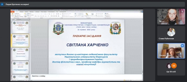 Розмаїттям, актуальністю відзначалися й доповіді інших доповідачів пленарного засідання: Aaronа Harforda, Ph.D candidate, Faculty of Electric Power Engineering and Automatics, Kyiv Polytechnic Institute of Igor Sikorsky; Joshua Kaplanа, B.A. in English, Russian Culture & Comparative Literature (Binghamton University, NY), ESL Teacher, Discussion Club Moderator, Educational Gamification Workshop Facilitator, Proofreader, Ukrainian Refugee Centre Volunteer; Маріанни Гольцової, Броніслави Рубінської, доцентів кафедри романо-германських мов і перекладу Національного університету біоресурсів і природокористування України.
